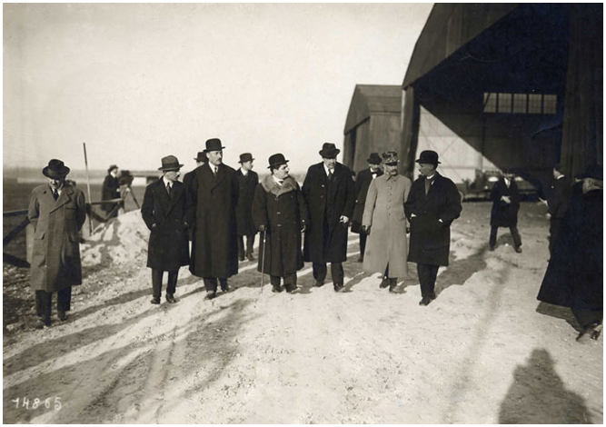 Parmi diverses personnalités, Victor Laurent-Eynac (au centre) et le colonel Saconney (à sa gauche), 12 février 1921