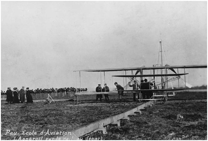 Le Flyer de Wilbur Wright sur son rail de lancement, Pau, 1909