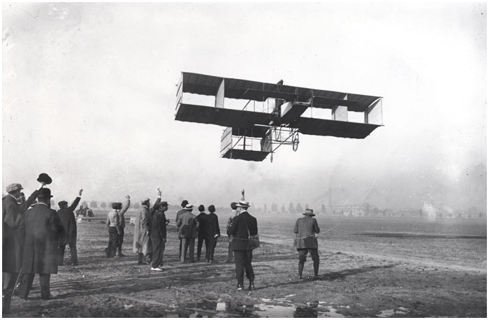 Henry Farman, premier kilomètre en circuit fermé, vue de 3/4, 13 janvier 1908, Issy-les Moulineaux